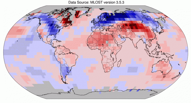 Mapa que muestra en colores temperaturas anómalas en Marzo de 2013, superficie terrestre y marina, en grados celsius. (NOAA)