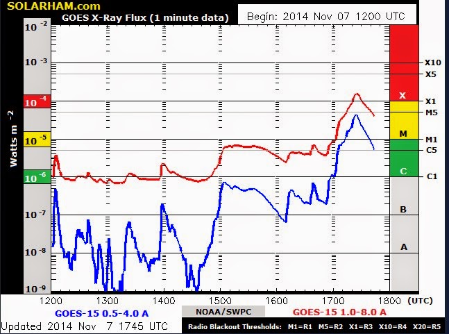 Una gran llamarada solar X1.6 (R3 - Fuerte apagón de radio) surgió de la mancha solar 2205, el 7 de noviembre de 2014. El evento comenzó a las 16:53, alcanzó su punto máximo a las 17: 26 y terminó a las 17:34 UTC.
